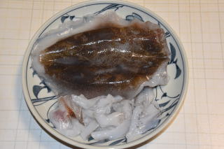 まず胴から頭と内臓を引き抜いて、胴内のえらを取り、ゲソを適当な長さに切り分ける。