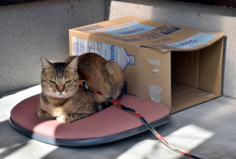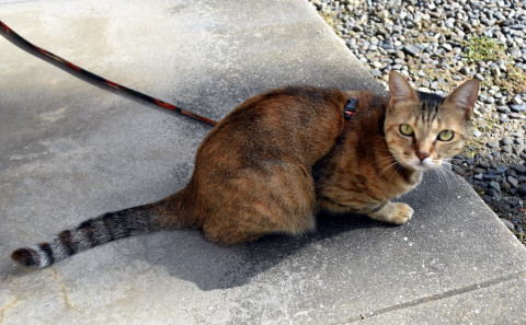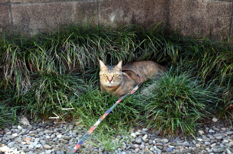 こうやってみると猫も番犬と同様にリードで繋いで外で飼えますね。モモも外が楽しくて仕方がないようです。元々生後一ヶ月半の時点で外で暮らしていた捨て猫又は野良猫だったからかもしれません。