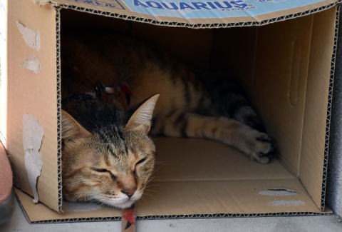 外で何をしているかと言うと座布団の上でうつらうつらしたり、段ボール箱に入って寝ている。